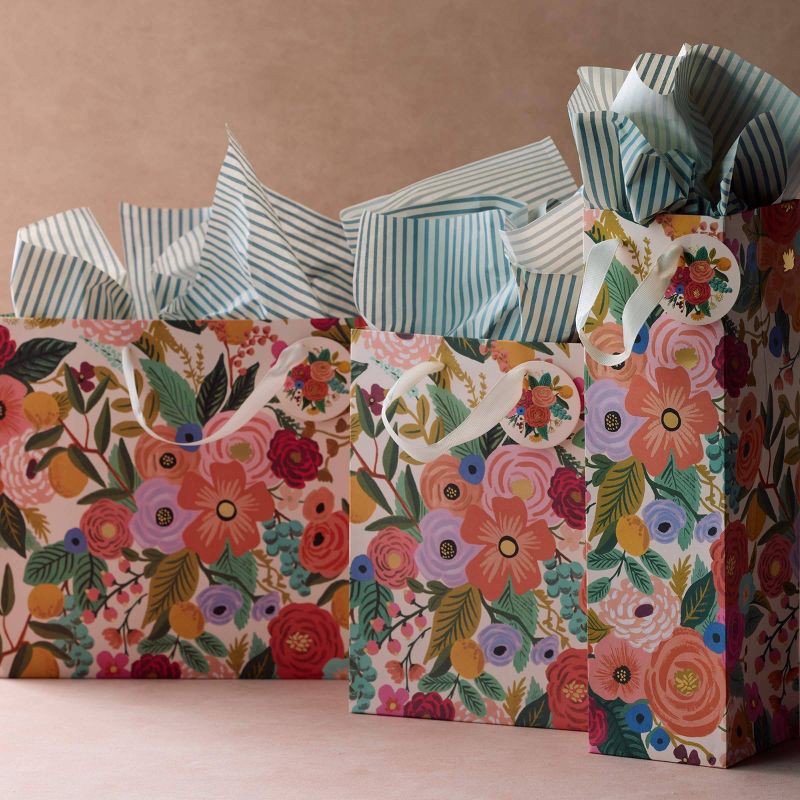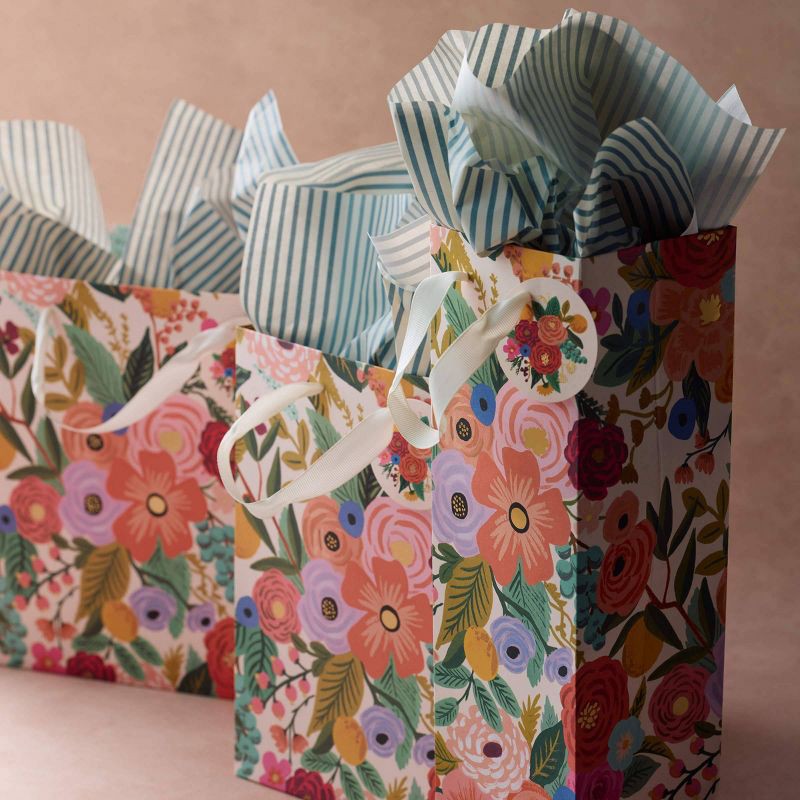 Share a celebratory bottle with an illustrated gift bag, featuring original Rifle Paper Co. florals, gold foil details, cotton ribbon handles, and a coordinating “To” and “From” tag. This style is ill…