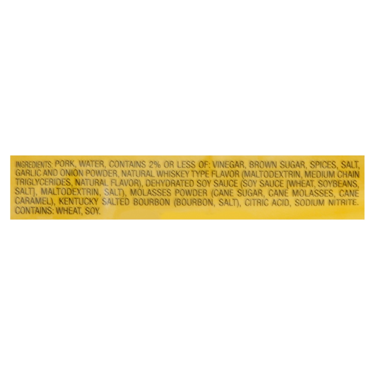 Pork, Water, Contains 2% or Less of: Vinegar, Brown Sugar, Spices, Salt, Garlic and Onion Powder, Natural Whiskey Type Flavor (Maltodextrin, Medium Chain Triglycerides, Natural, Flavor), Dehydrated So…