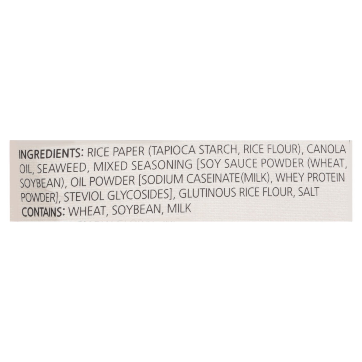 Rice Paper (Tapioca Starch, Rice Flour), Canola Oil, Seaweed, Mixed Seasoning [Soy Sauce Powder (Wheat, Soybean), Oil Powder [Sodium Caseinate (Milk), Whey Protein Powder], Steviol Glycosides], Glutin…