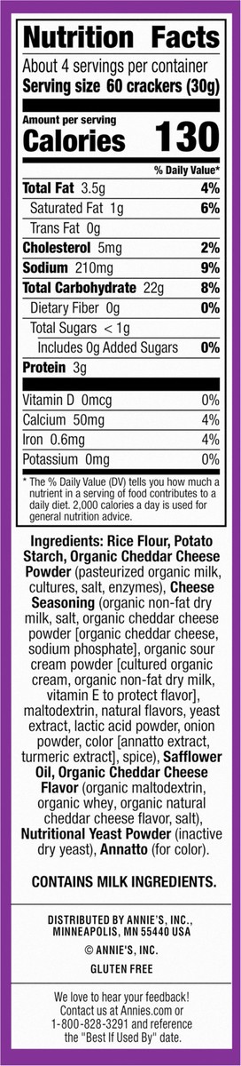 Rice Flour, Potato Starch, Organic Cheddar Cheese Powder (Pasteurized Organic Milk, Cultures, Salt, Enzymes), Cheese Seasoning (Organic Non-Fat Dry Milk, Salt, Organic Cheddar Cheese Powder [Organic C…