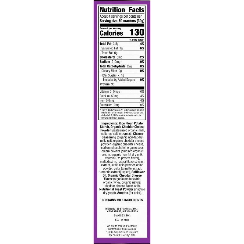 Rice Flour, Potato Starch, Organic Cheddar Cheese Powder (Pasteurized Organic Milk, Cultures, Salt, Enzymes), Cheese Seasoning (Organic Non-Fat Dry Milk, Salt, Organic Cheddar Cheese Powder [Organic C…