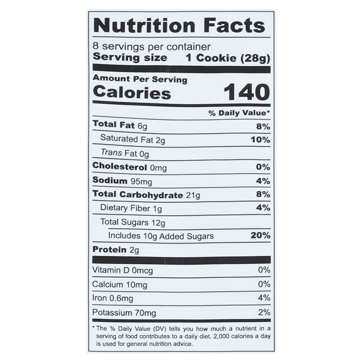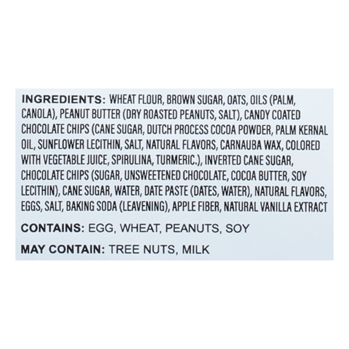 Wheat Flour, Brown Sugar, Oats, Oils (Palm, Canola), Peanut Butter (Dry Roasted Peanuts, Salt), Candy Coated Chocolate Chips (Cane Sugar, Dutch Process Cocoa Powder, Palm Kernal Oil, Sunflower Lecithi…