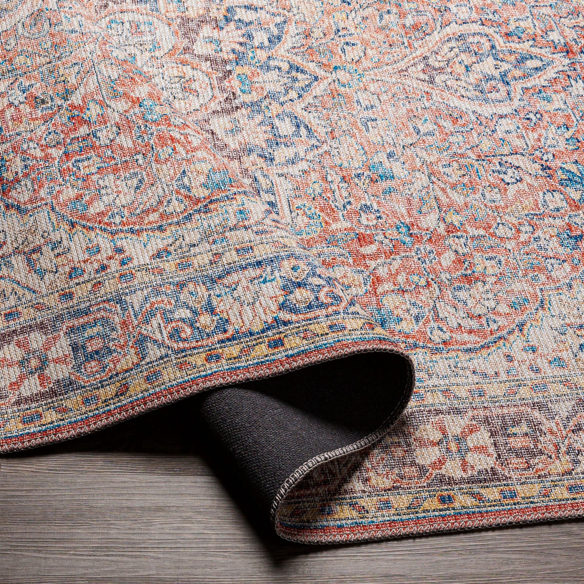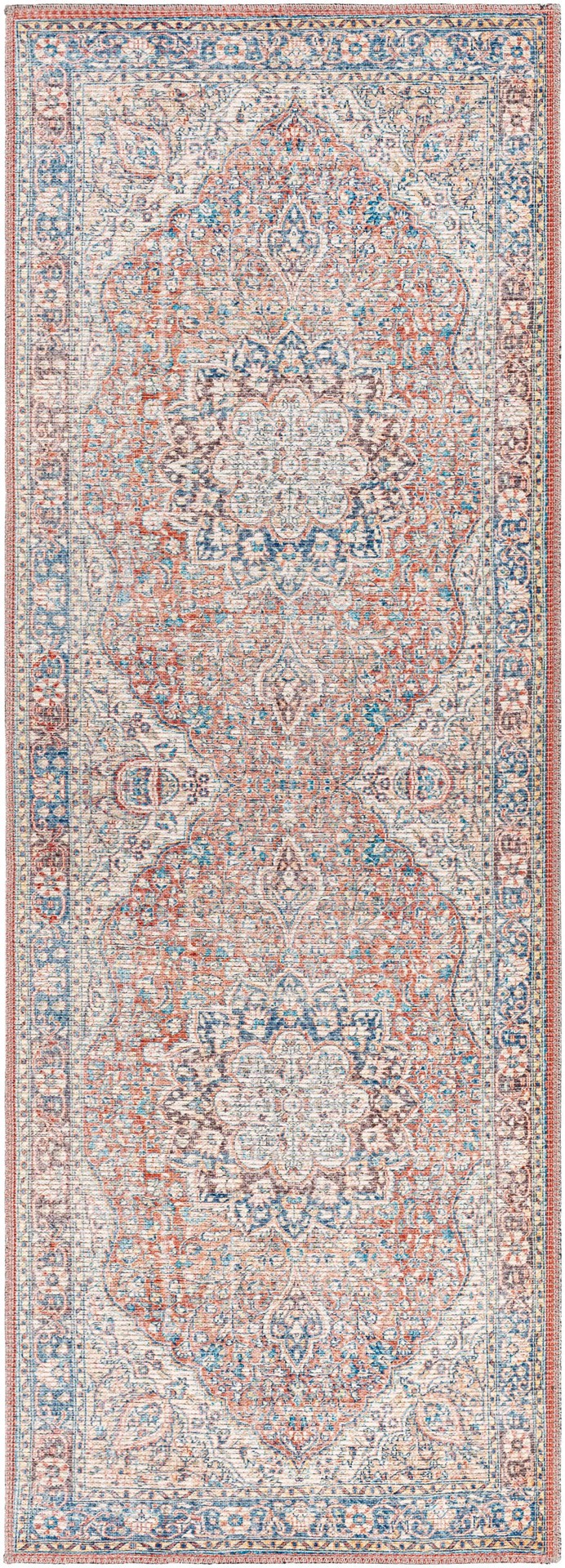 Polyester stain-resistant, making it perfect for high traffic areas. Persian-inspired medallion pattern in rust, blue, and beige adds timeless character. .02-in pile height is comfortable underfoot an…