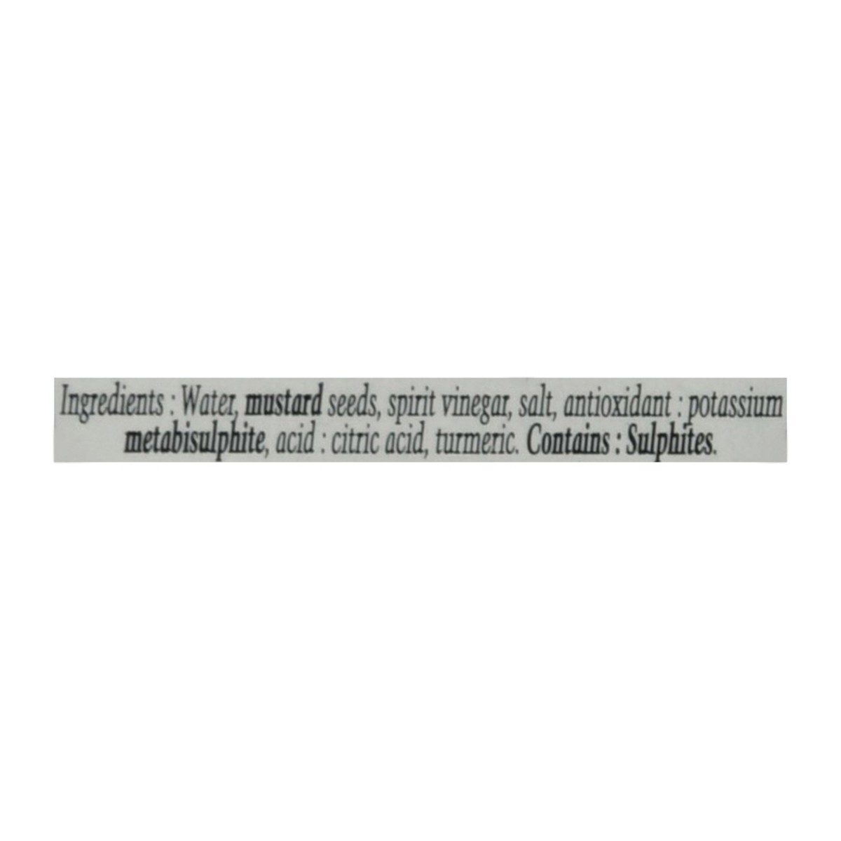 Water, Mustard Seeds, Spirit Vinegar, Salt, Antioxidant: Potassium Metabisulphite, Acid: Citric Acid, Turmeric.