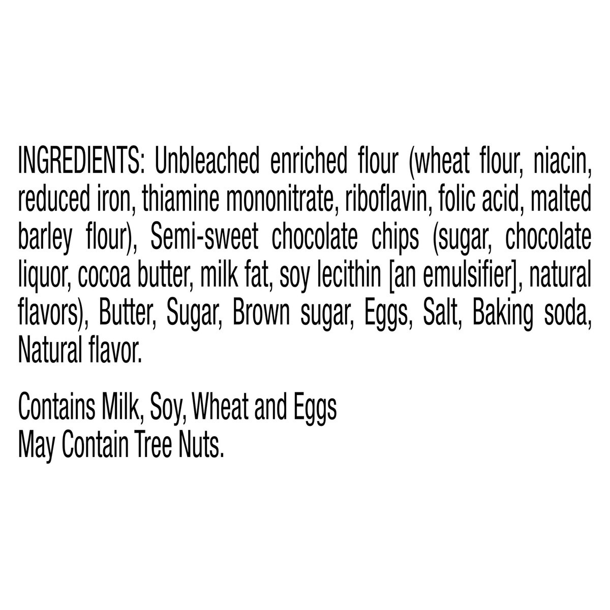 Unbleached Enriched Flour (Wheat Flour, Niacin, Reduced Iron, Thiamine Mononitrate, Riboflavin, Folic Acid, Malted Barley Flour), Semi-Sweet Chocolate Chips (Sugar, Chocolate Liquor, Cocoa Butter, Mil…