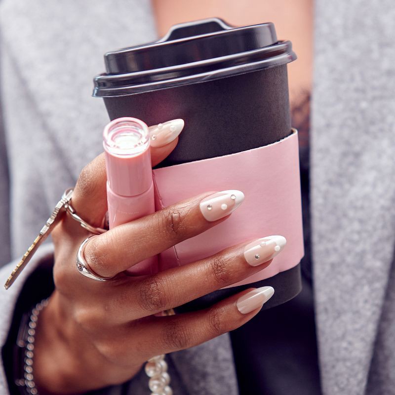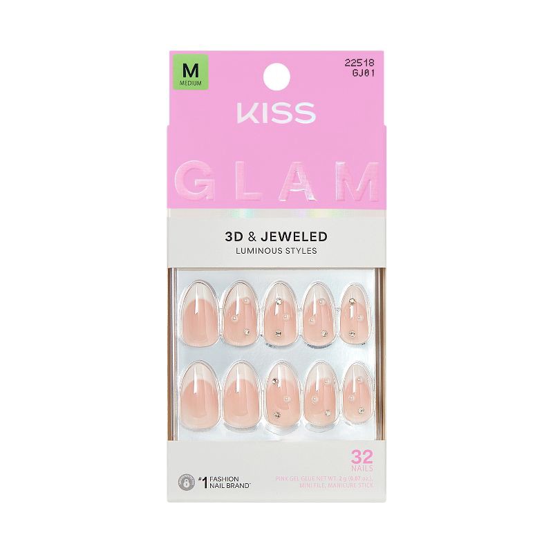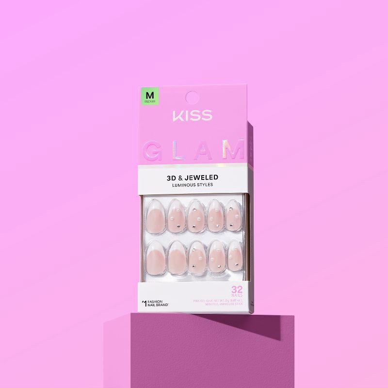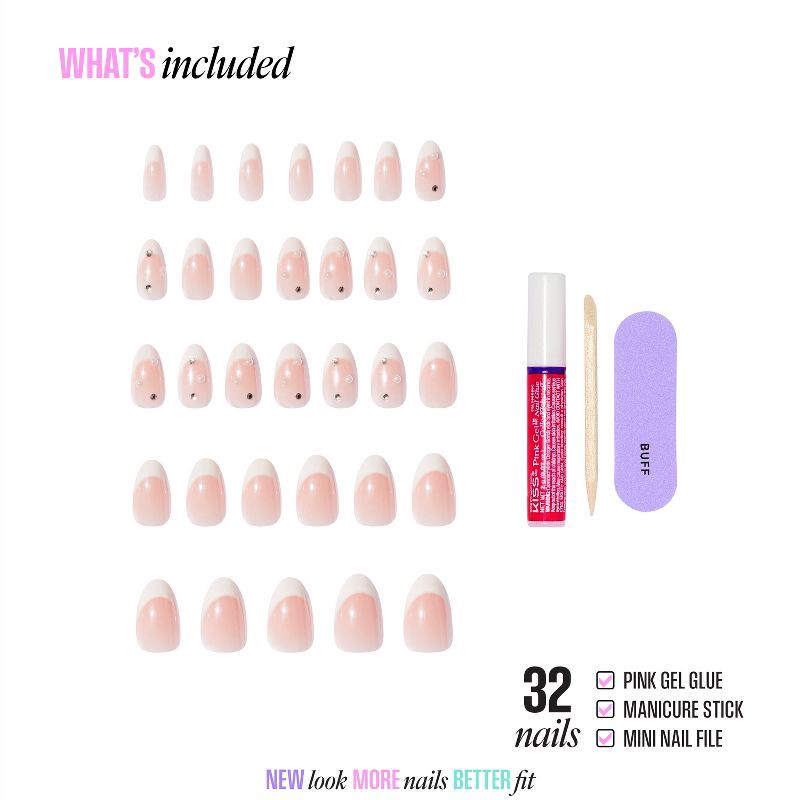NEW Look. MORE Nails. BETTER Fit! Trend-forward and polished, these medium almond Kiss GLAM ‘Serendipity Awaits' nails pair a soft translucent pink base with white French tips, pearls, and rhinestones…