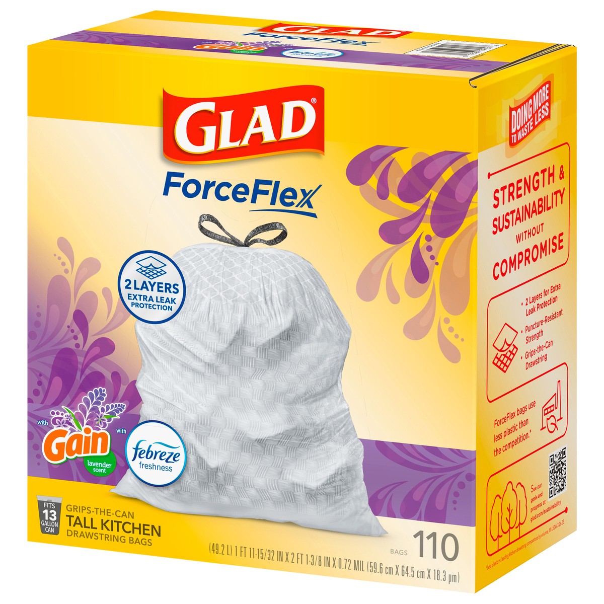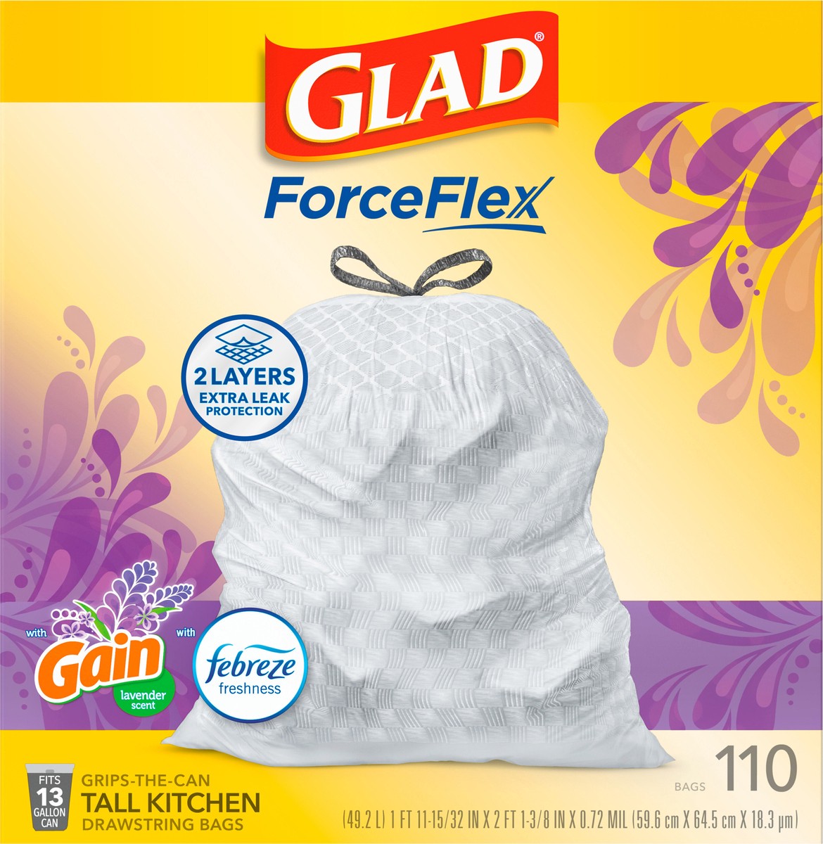Glad Forceflex Tall Kitchen Drawstring Trash Bags 13 Gallon Gain Lavender With Febreze - 110 Count