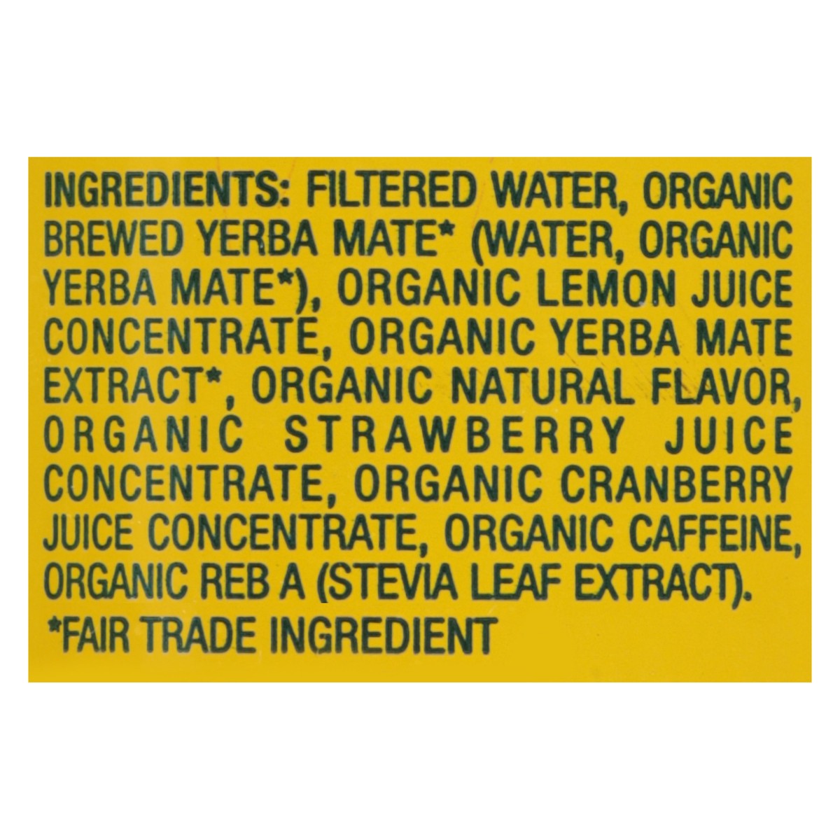 Filtered Water, Organic Brewed Yerba Mate* (Water, Organic Yerba Mate*), Organic Lemon Juice Concentrate, Organic Yerba Mate Extract*, Organic Natural Flavor, Organic Strawberry Juice Concentrate, Org…