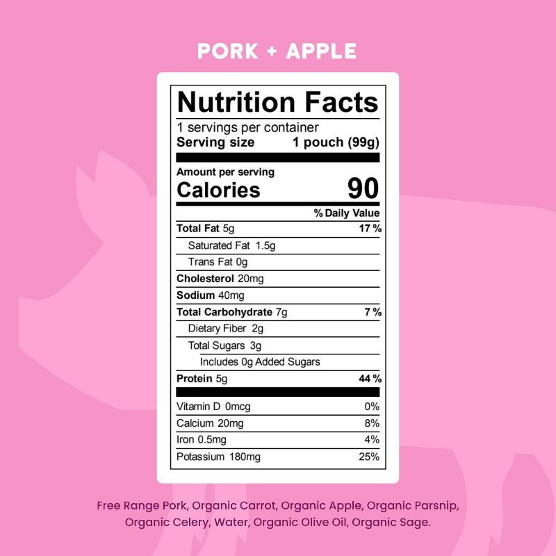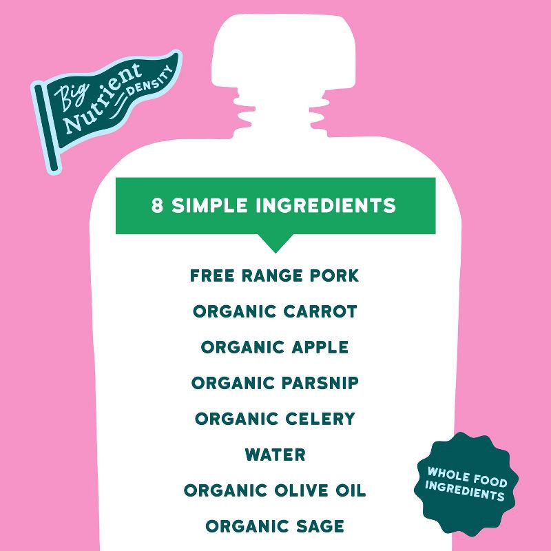 Free Range Pork, Organic Carrot, Organic Apple, Organic Parsnip, Organic Celery, Water, Organic Olive Oil, Organic Sage.