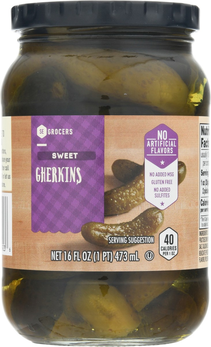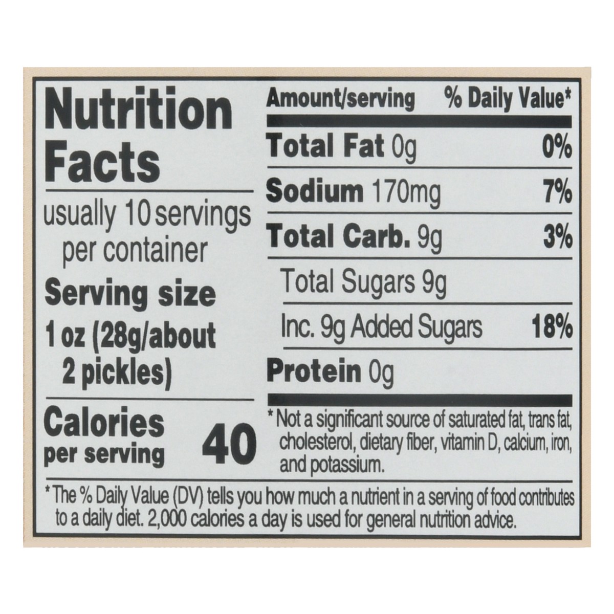 Cucumbers, High Fructose Corn Syrup, Vinegar, Water, Salt, Calcium Chloride, Alum, Sodium Benzoate (Preservative), Natural Flavors, Polysorbate 80, Yellow 5.