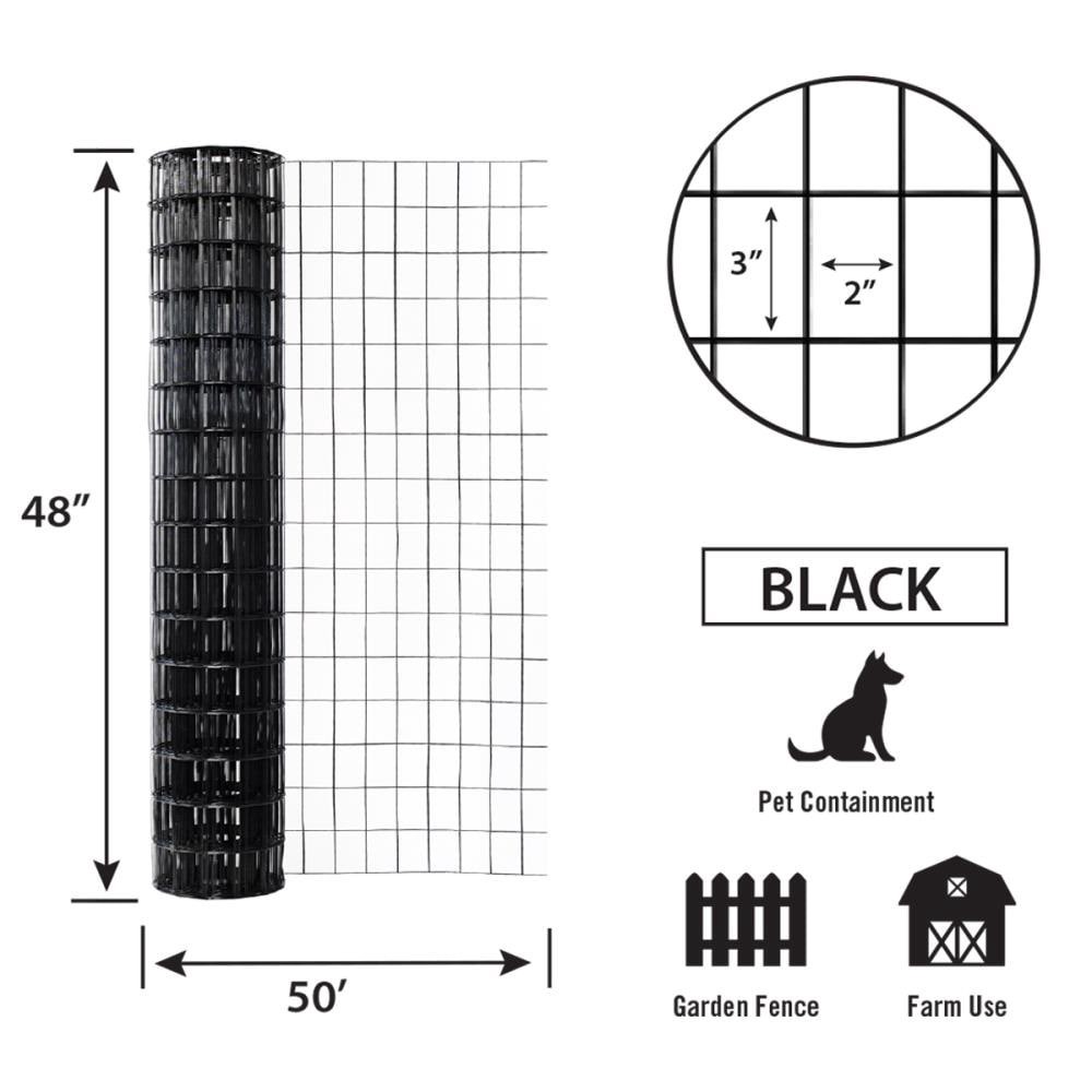 48in H x 50ft L. Constructed of vinyl coated steel wire. 2in x 3in opening. PVC coating adds durability and aids in rust prevention. Use with 5ft light duty fence post. Recommended uses include: gardeā¦