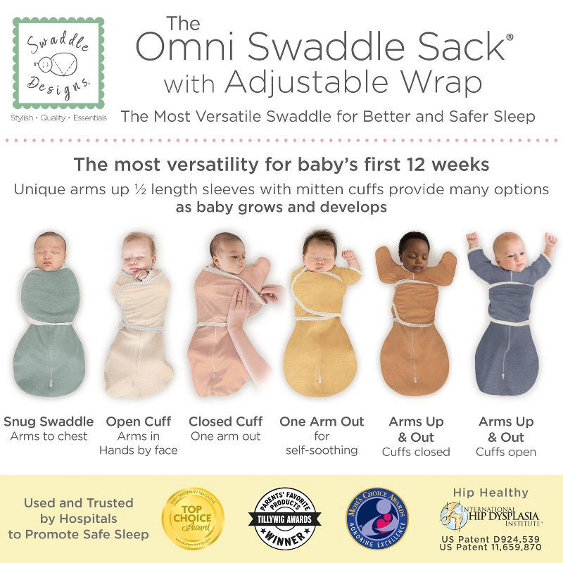 - The SwaddleDesigns Omni Swaddle Sack smoothly adapts during baby's first 12 weeks.