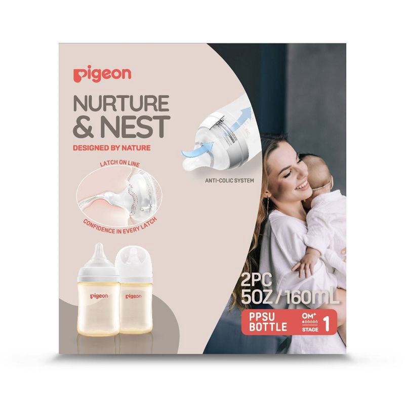 Pigeon Nurture & Nest Wide-Neck and Anti-colic PPSU BPA-Free Baby Bottles with Nipples - 5 fl oz/2pk