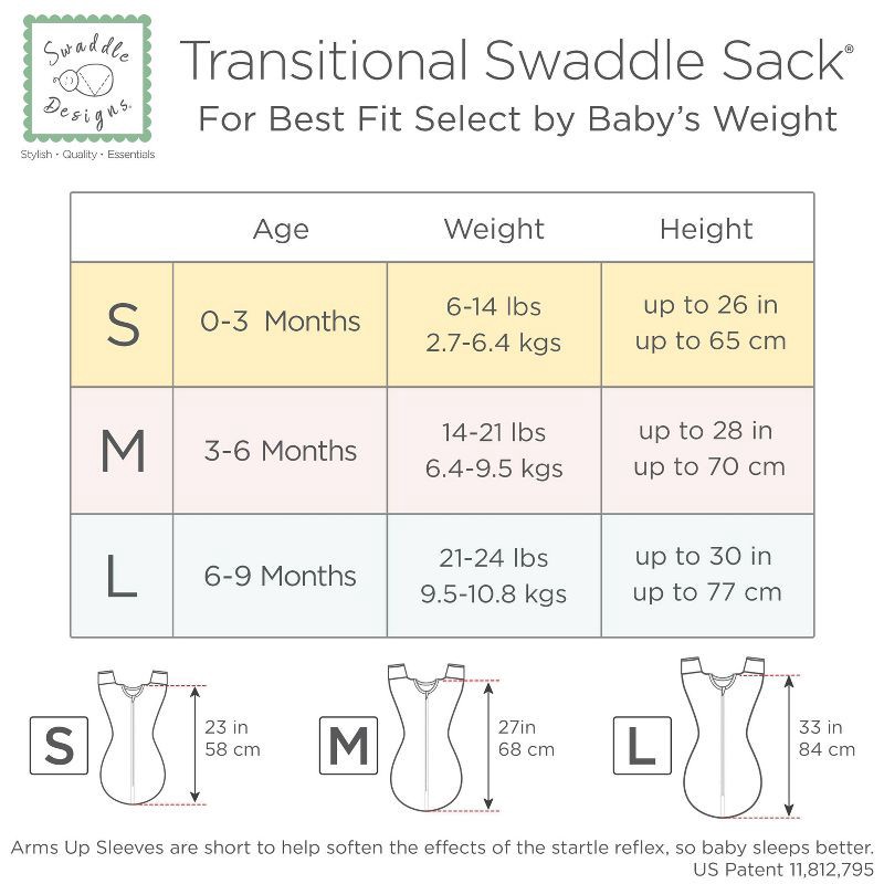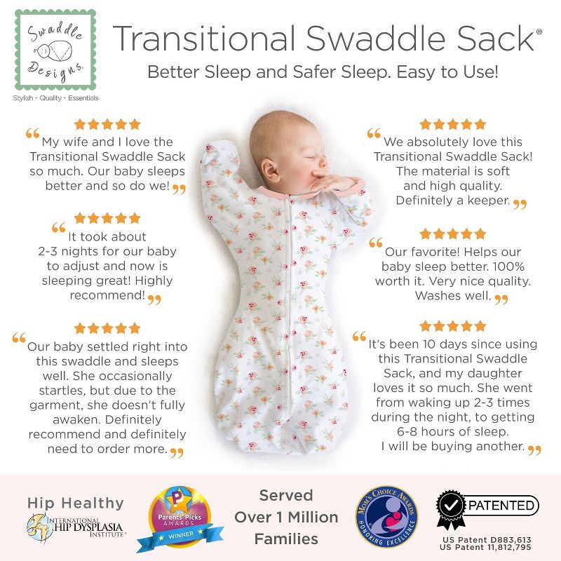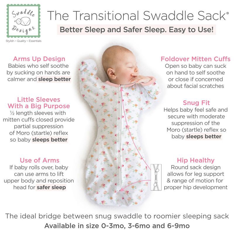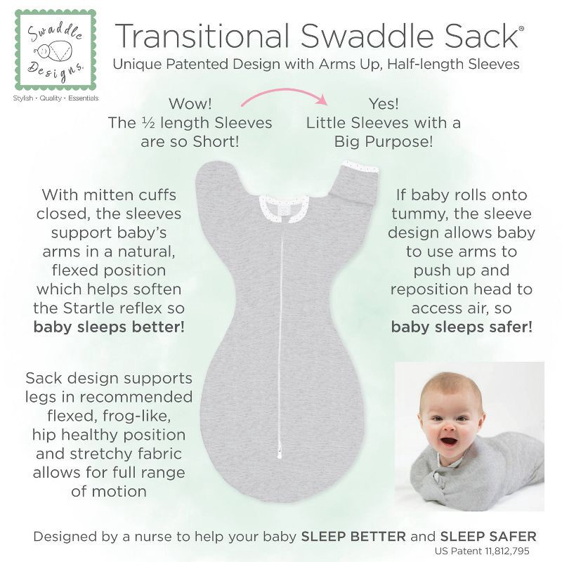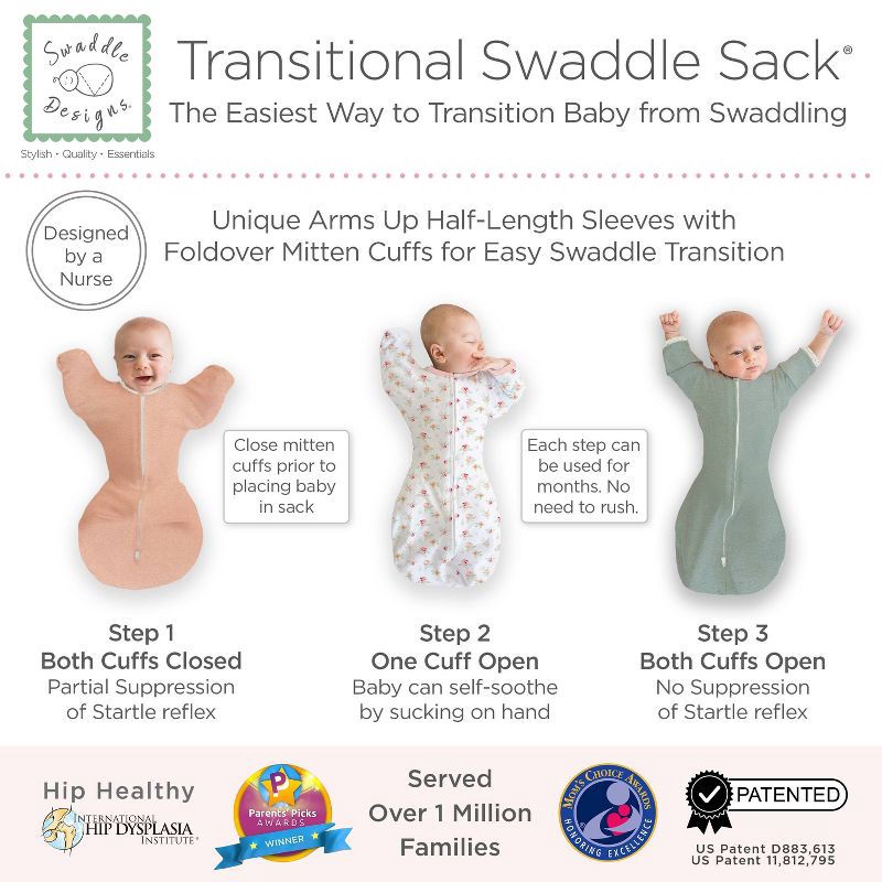The SwaddleDesigns Transitional Swaddle Sack® is the easiest and safest way to transition baby from a snug swaddle. It features Little Sleeves with a Big Purpose™. When parents close the mitten cuffs …