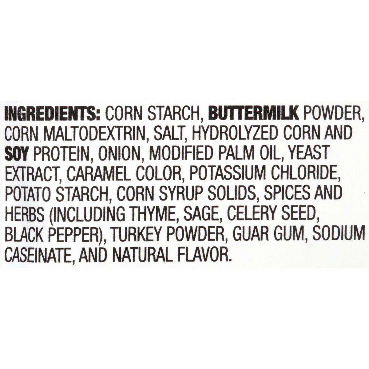 Corn Starch, Buttermilk Powder, Corn Maltodextrin, Salt, Hydrolyzed Corn and Soy Protein, Onion, Modified Palm Oil, Yeast Extract, Caramel Color, Potassium Chloride, Potato Starch, Corn Syrup Solids, …