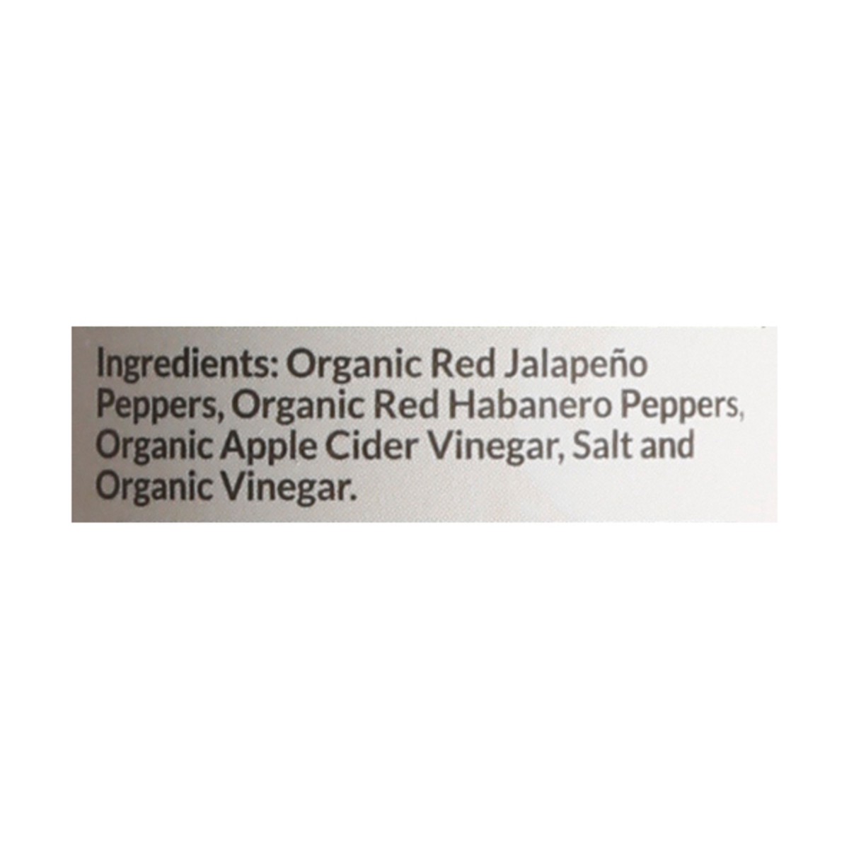 Organic Red Jalapeno Peppers, Organic Red Habanero Peppers, Organic Apple Cider Vinegar, Salt and Organic Vinegar.