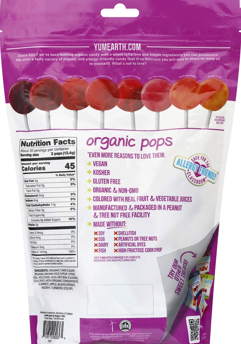 Organic Cane Sugar, Organic Brown Rice Syrup, Organic Natural Flavors, Citric Acid, Ascorbic Acid, Colored with Organic Fruit and Vegetable Concentrates, Organic Turmeric Extract (Color).