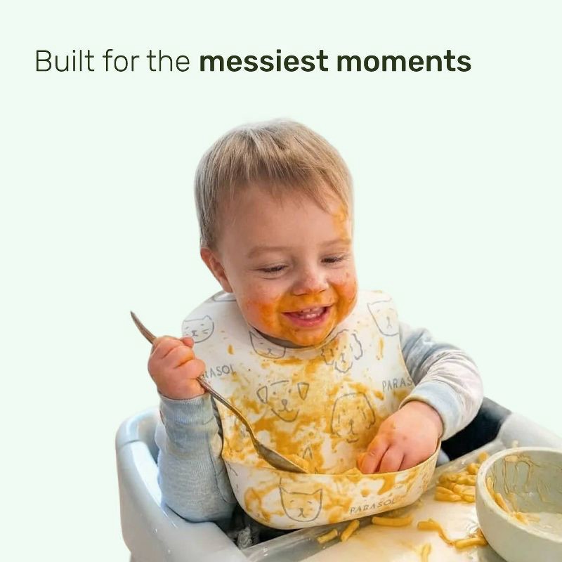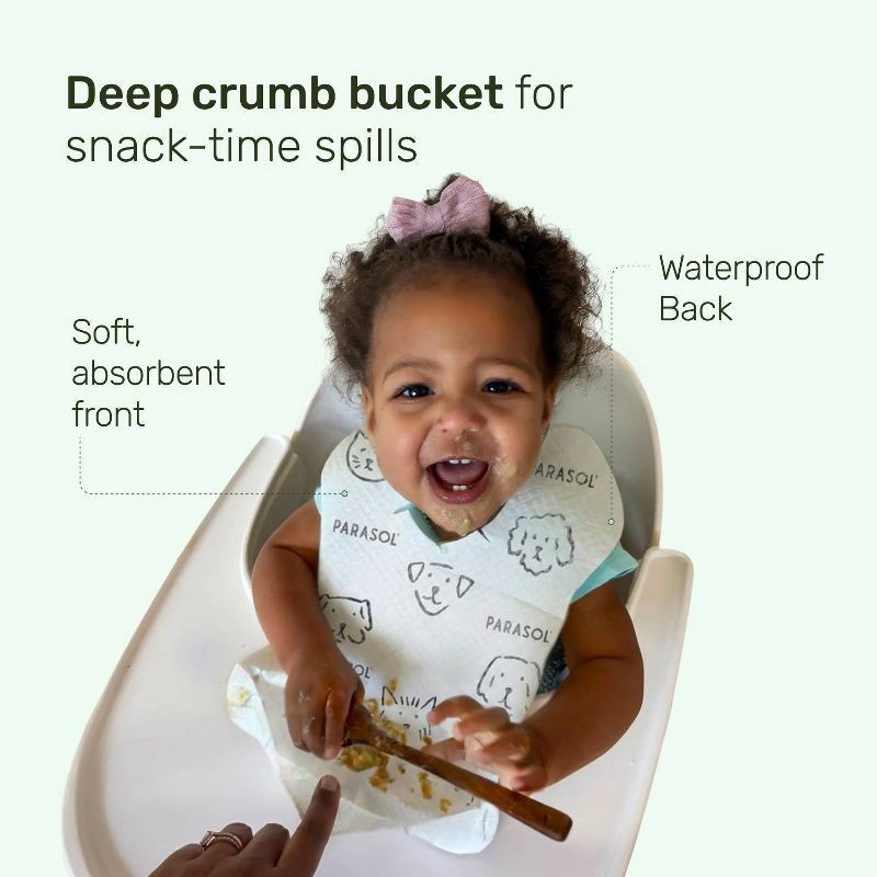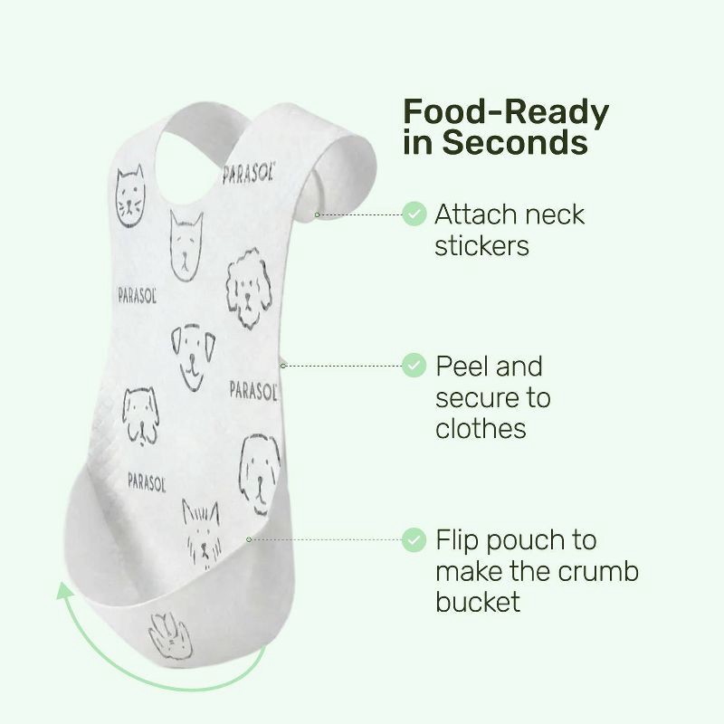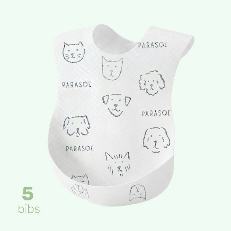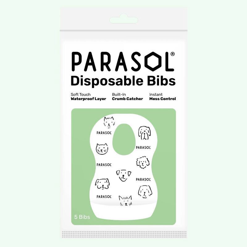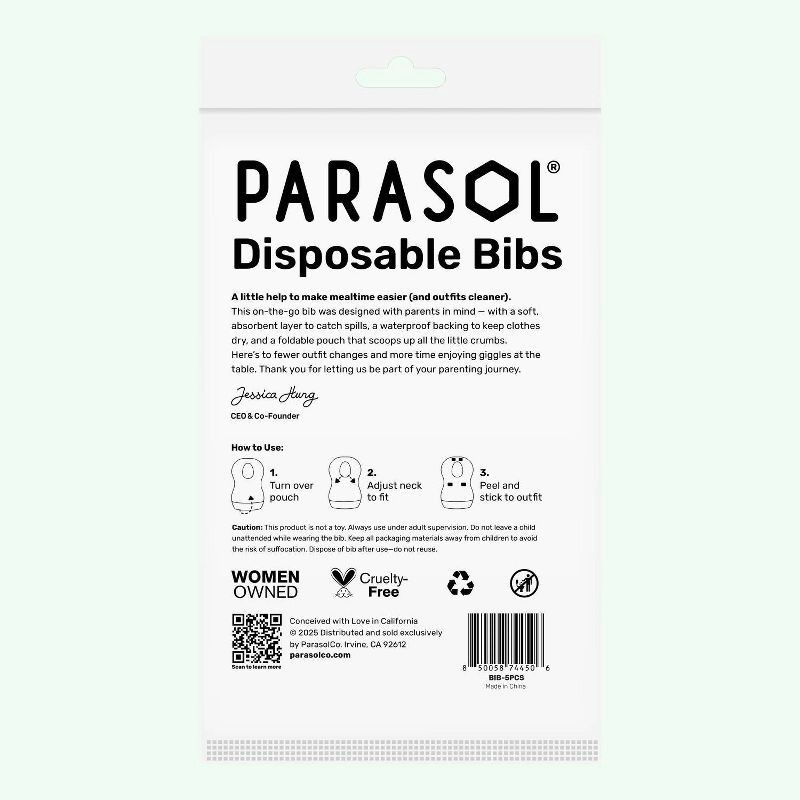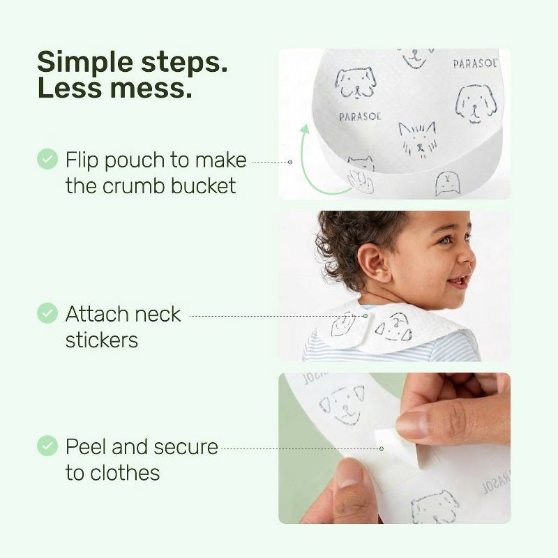 Parasol Disposable Bibs — A little help to make mealtime easier (and outfits cleaner).Simple steps. Less mess. Happier mealtimes.1. Turn over pouch2. Adjust neck to fit3. Peel and stick to outfitThis …