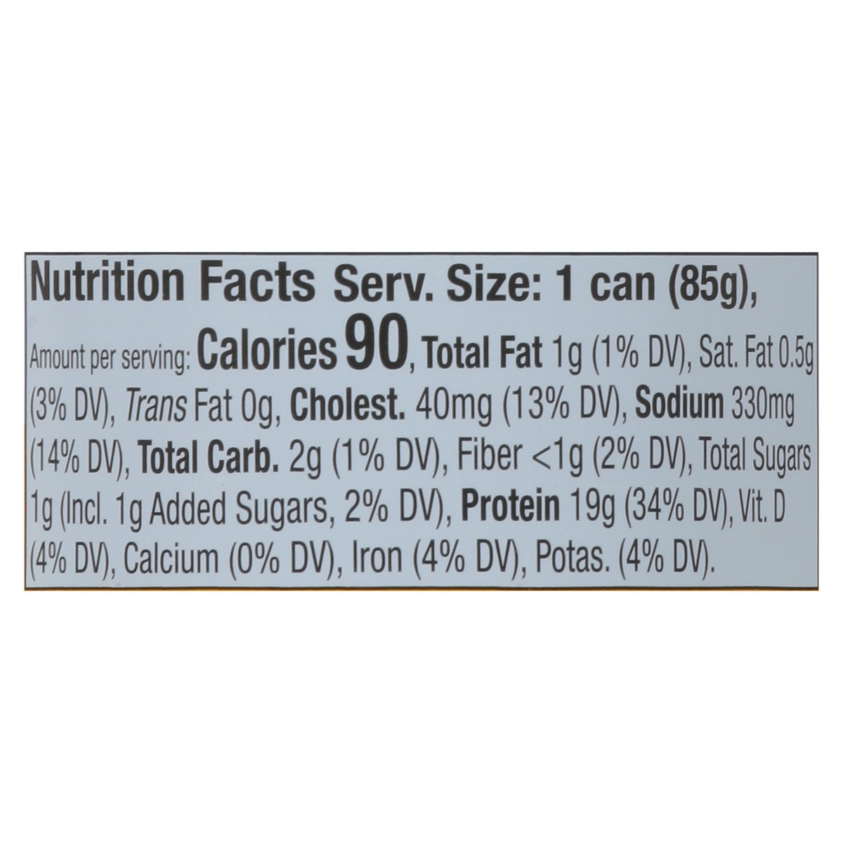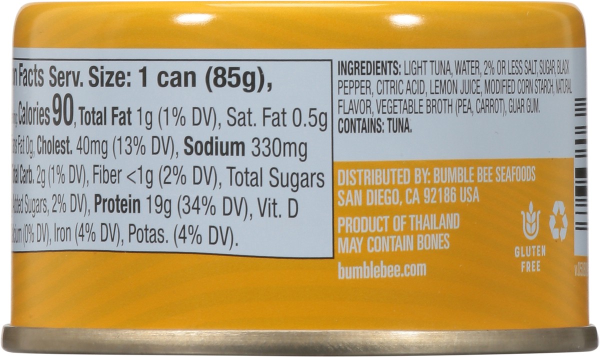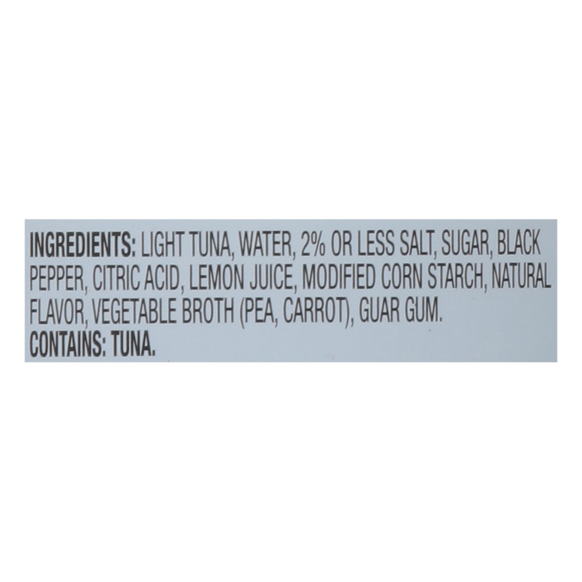 Light Tuna\, Water\, 2% or Less Salt\, Sugar\, Black Pepper\, Citric Acid\, Lemon Juice\, Modified Corn Starch\, Natural Flavor\, Vegetable Broth (Pea\, Carrot)\, Guar Gum.