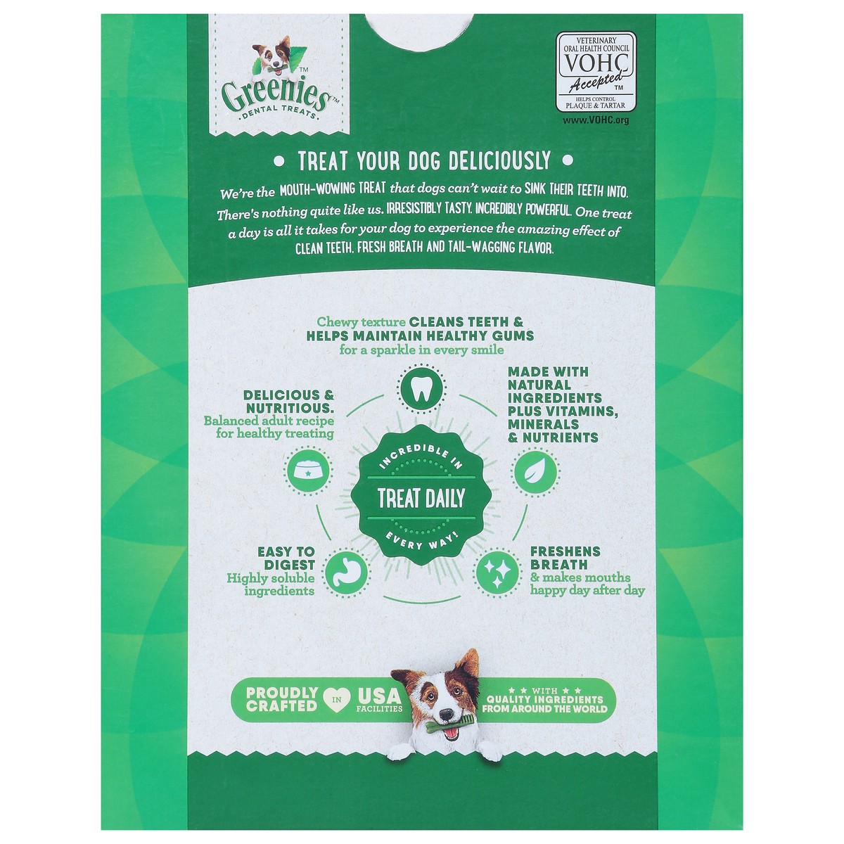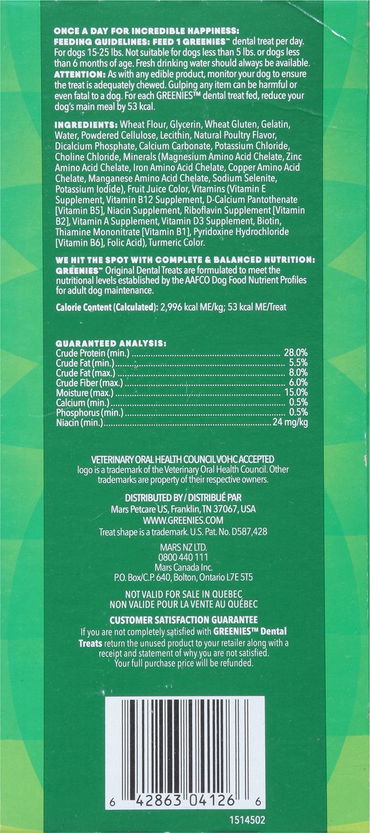 Calorie Content (calculated): 2,996 kcal ME/kg; 53 kacl ME/Treat We Hit the Spot with Complete & Balanced Nutrition: Greenies Original Dental Treats are formulated to meet the nutritional level establ…