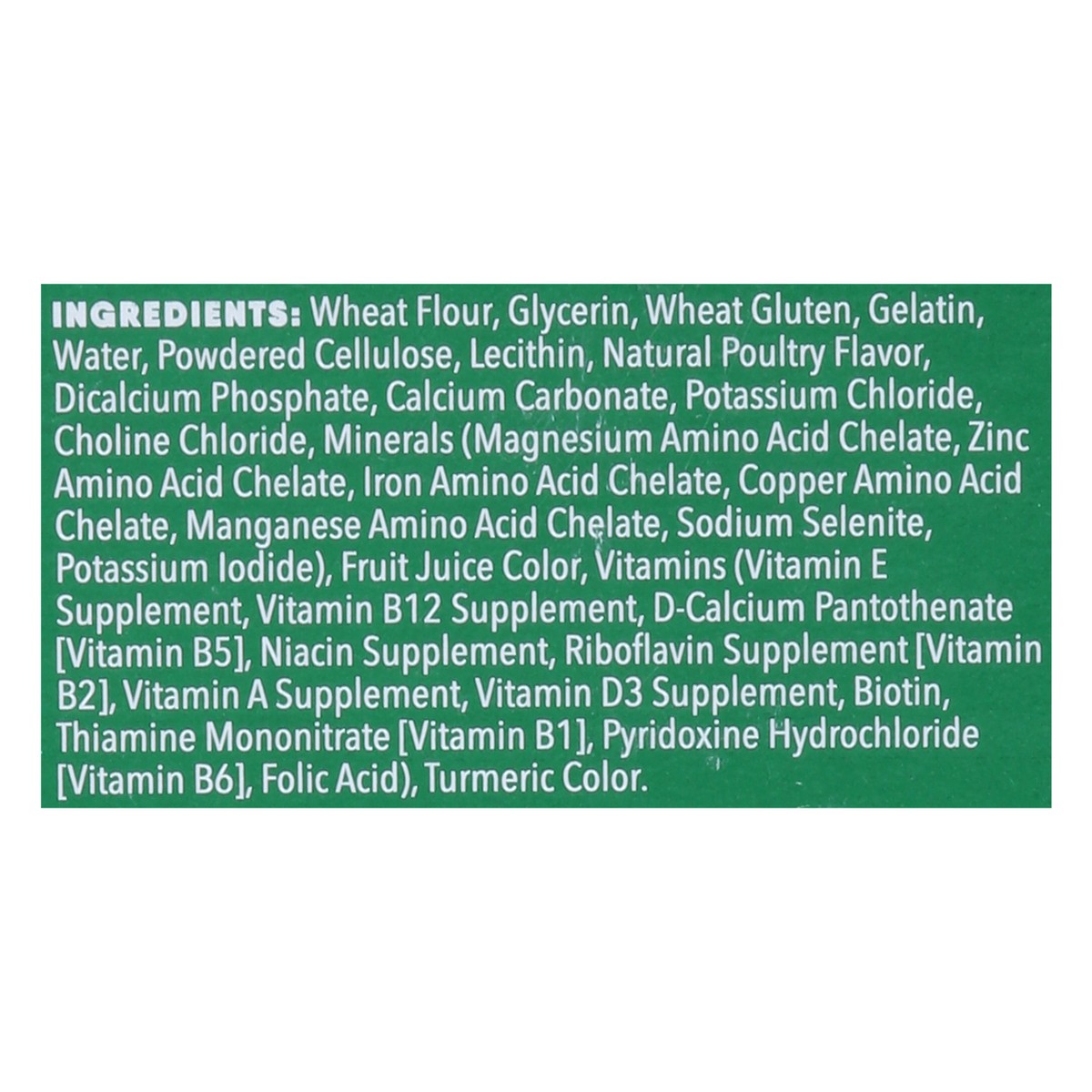 Wheat Flour, Glycerin, Wheat Gluten, Gelatin, Water, Powdered Cellulose, Lecithin, Natural Poultry Flavor, Dicalcium Phosphate, Calcium Carbonate, Potassium Chloride, Choline Chloride, Magnesium Amino…