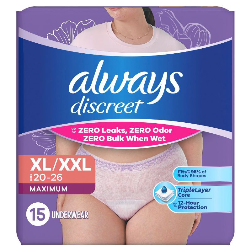 Try Always Discreet incontinence underwear for women. These reimagined adult diapers for women have up to zero leaks, zero odor, and zero bulk when wet for incontinence protection you can depend on. D…