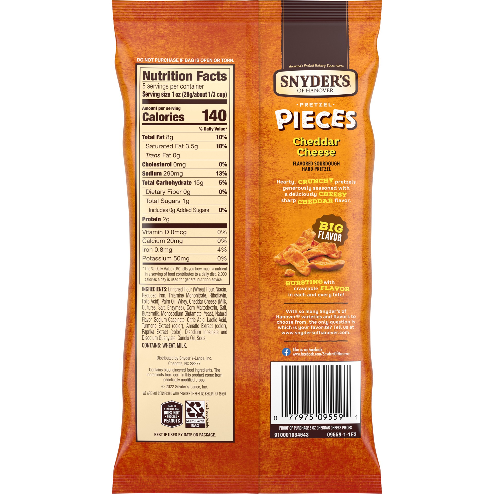 - Includes one (1) 5-ounce bag of Snyder''s of Hanover Cheddar Cheese Flavored Pretzel Pieces