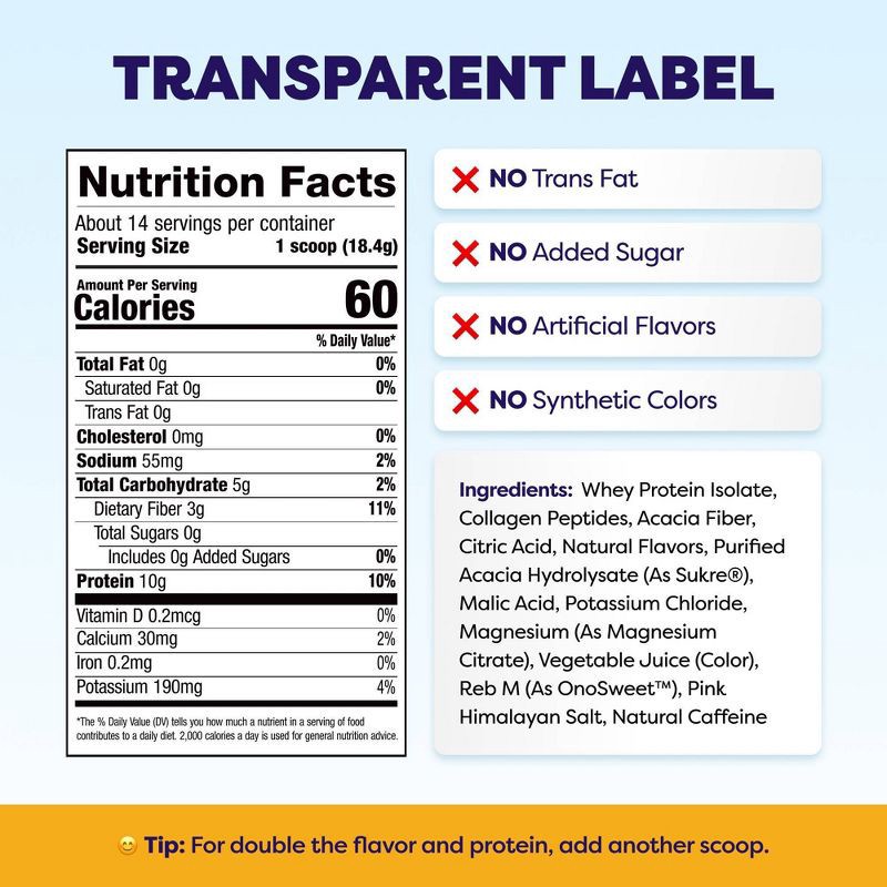 Whey Protein Isolate, Collagen Peptides, Acacia Fiber, Citric Acid, Natural Flavors, Purified Acacia Hydrolysate (as Sukre), Malic Acid, Potassium Chloride, Magnesium (as Magnesium Citrate), Vegetable…