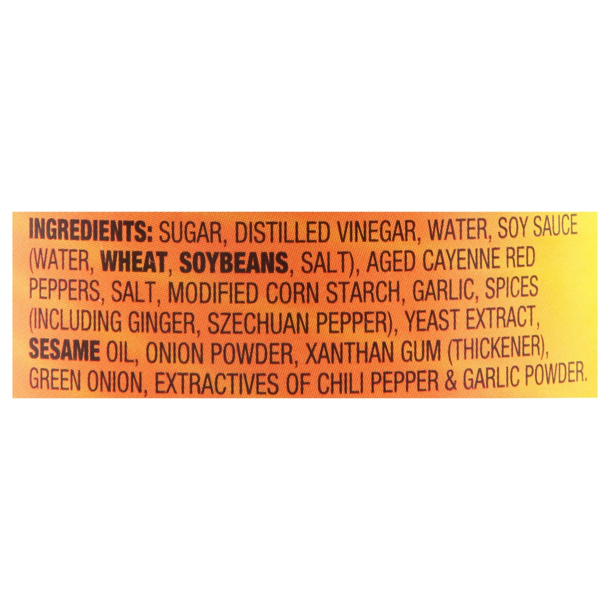 SUGAR, DISTILLED VINEGAR, WATER, SOY SAUCE (WATER, SOYBEANS, WHEAT, SALT), AGED CAYENNE RED PEPPERS, SALT, MODIFIED CORN STARCH, GARLIC, SPICES (INCLUDING GINGER, SZECHUAN PEPPER), YEAST EXTRACT, SESA…
