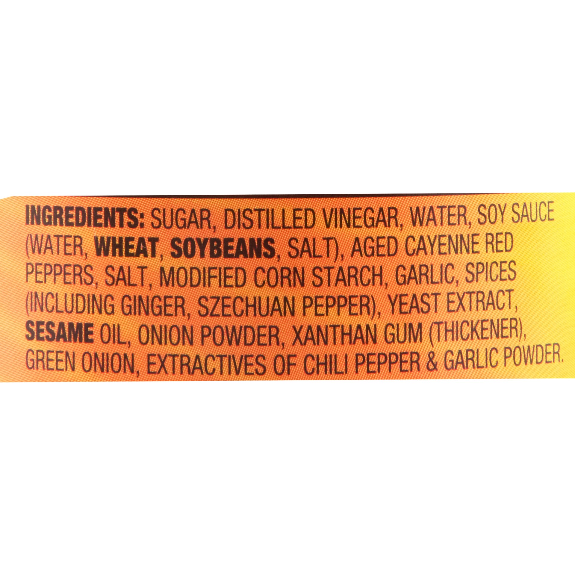SUGAR, DISTILLED VINEGAR, WATER, SOY SAUCE (WATER, SOYBEANS, WHEAT, SALT), AGED CAYENNE RED PEPPERS, SALT, MODIFIED CORN STARCH, GARLIC, SPICES (INCLUDING GINGER, SZECHUAN PEPPER), YEAST EXTRACT, SESA…