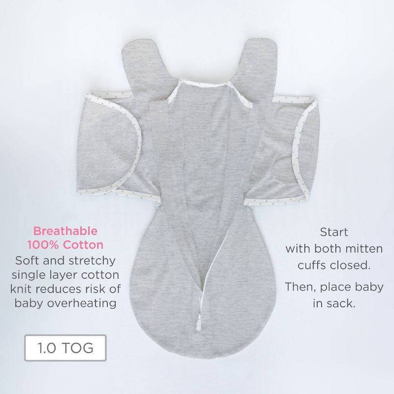 - Uniquely-shaped ½-length sleeves with mitten cuffs closed provide partial suppression of Moro (startle) reflex when arms are up and enough arm mobility to push up if baby were to roll over.