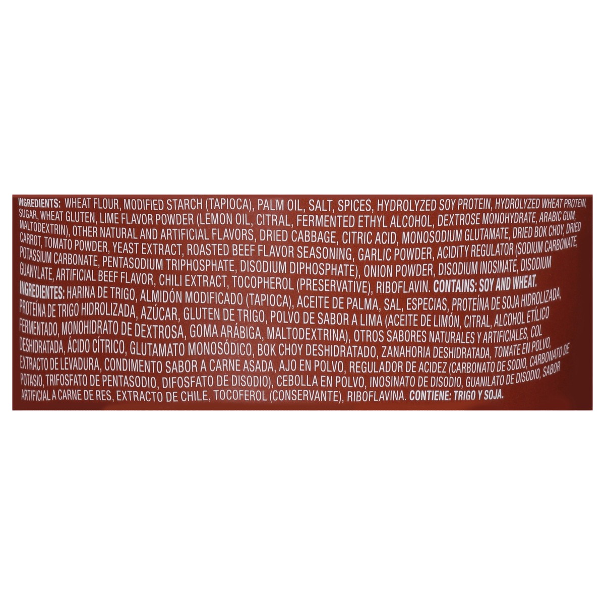 Wheat Flour, Modified Starch (Tapioca), Palm Oil, Salt, Spices, Hydrolyzed Soy Protein, Hydrolyzed Wheat Protein, Sugar, Wheat Gluten, Lime Flavor Powder (Lemon Oil, Citral, Fermented Ethyl Alcohol, D…