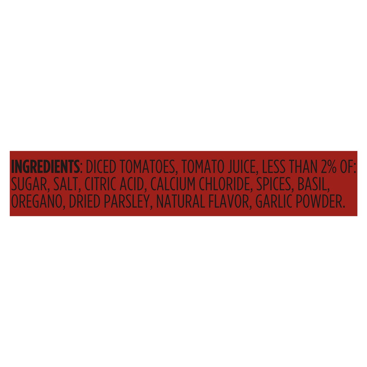 Diced Tomatoes, Tomato Juice, Less than 2% of: Sugar, Salt, Citric Acid, Calcium Chloride, Spices, Basil, Oregano, Dried Parsley, Natural Flavor, Garlic Powder.