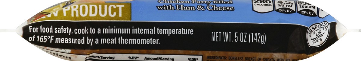Raw breaded white chicken patty filled with ham & cheese. A family tradition of quality. Raw chicken. Raw product. Per 5 Oz Serving: 280 calories; 4.5 g sat fat (24% DV); 690 mg sodium (29% DV); 0 g s…