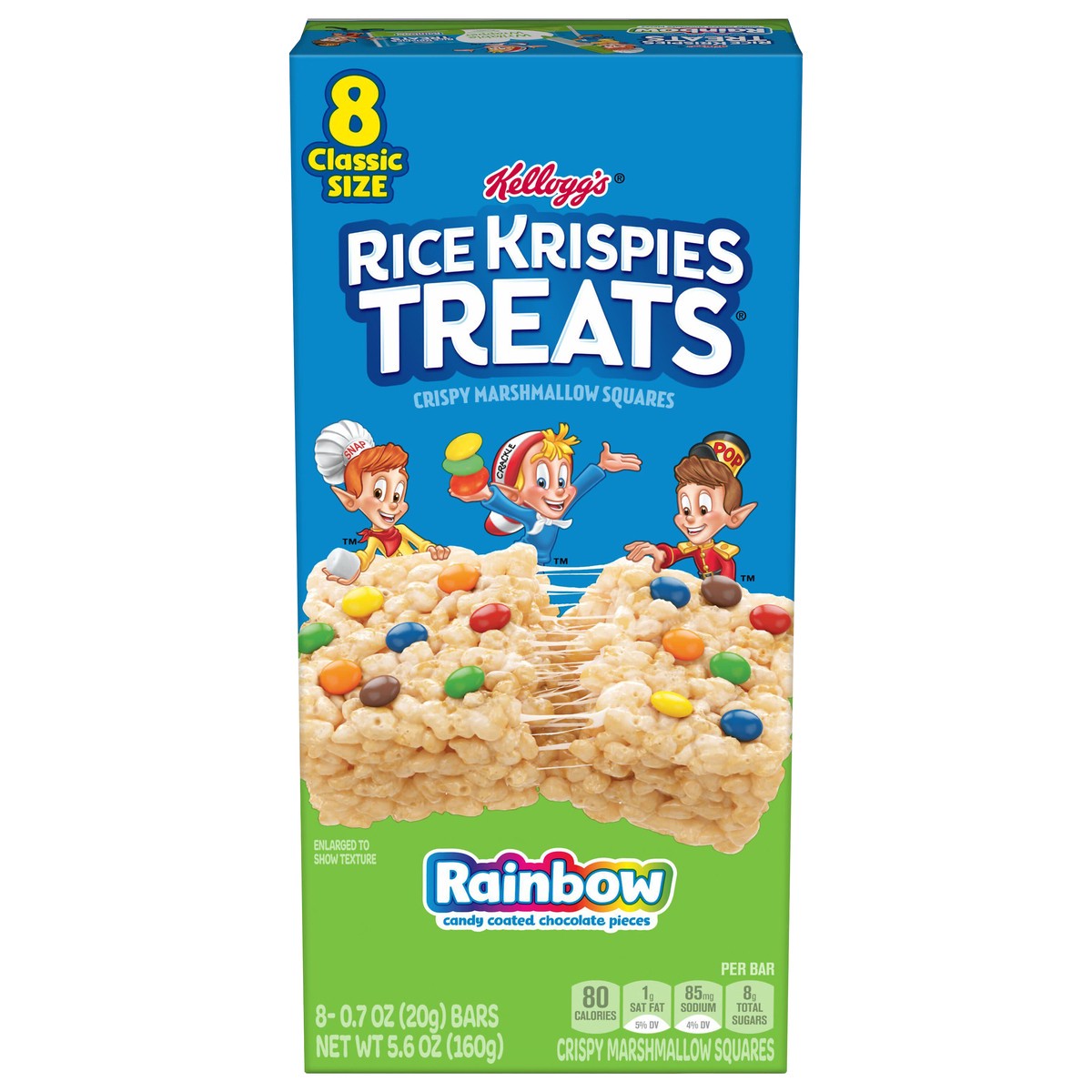 - 5.6oz box containing eight Kellogg's Rice Krispies Treats Rainbow Marshmallow Snack Bars; Packaged for freshness and great taste