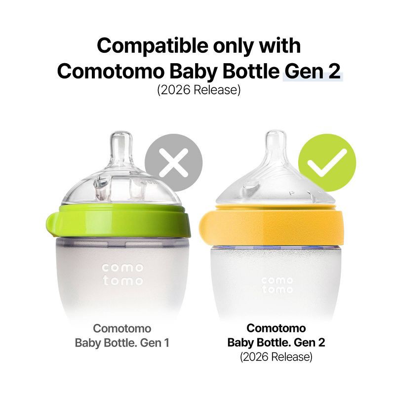 - MADE FOR COMOTOMO BABY BOTTLES GEN 2 (2026 NEW RELEASE): Compatible with ONLY Comotomo Baby Bottles Gen 2. Please note that this nipple will NOT fit Comotomo Gen 1 Bottles.