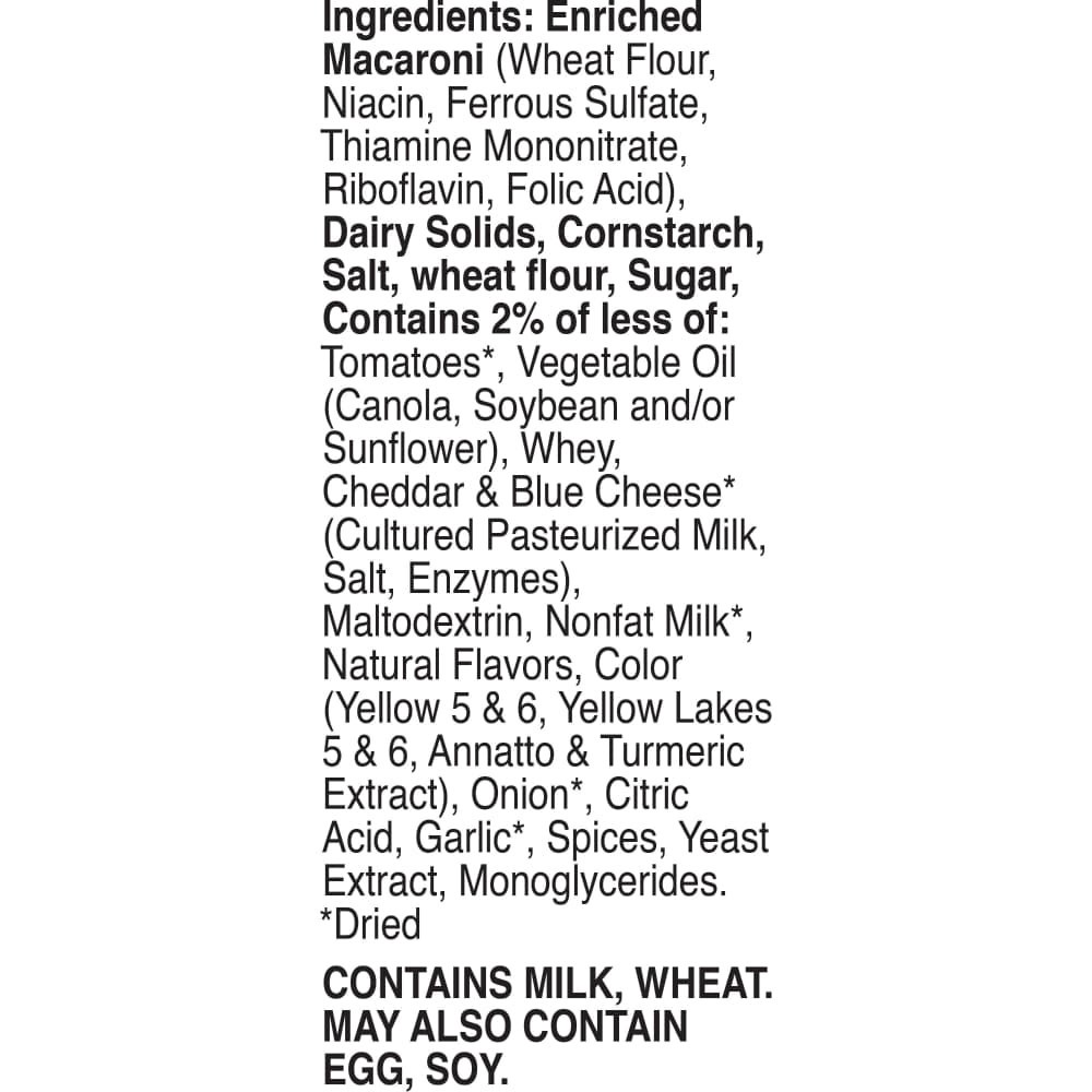Enriched Macaroni (Wheat Flour, Niacin, Ferrous Sulfate, Thiamine Mononitrate, Riboflavin, Folic Acid), Dairy Solids, Cornstarch, Salt, Wheat Flour, Sugar, Contains 2% of Less of: Tomatoes (Dried), Ve…