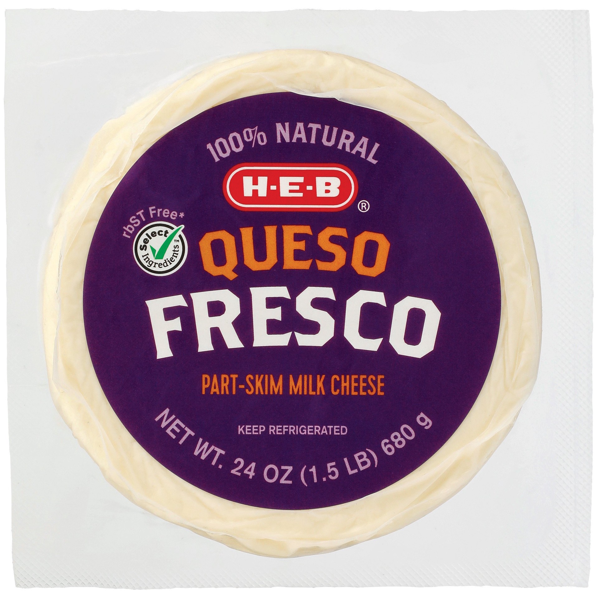 Add a big wheel of H-E-B queso fresco to your cart. Creamy and mild in flavor, this part-skim cheese is easy to crumble and sprinkle onto guacamole, enchiladas or beans. Even better, it's made with rB…