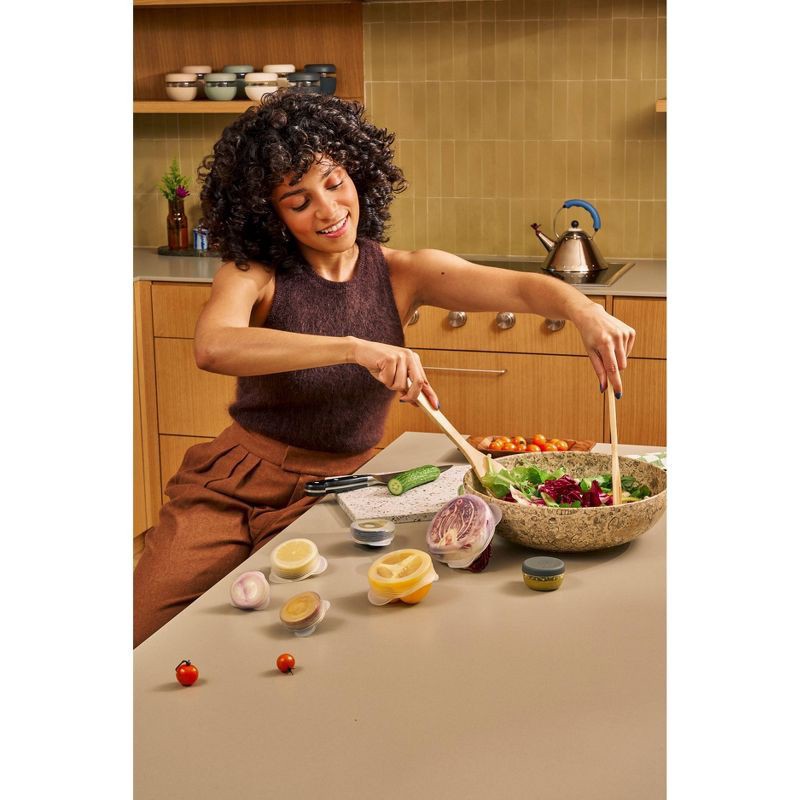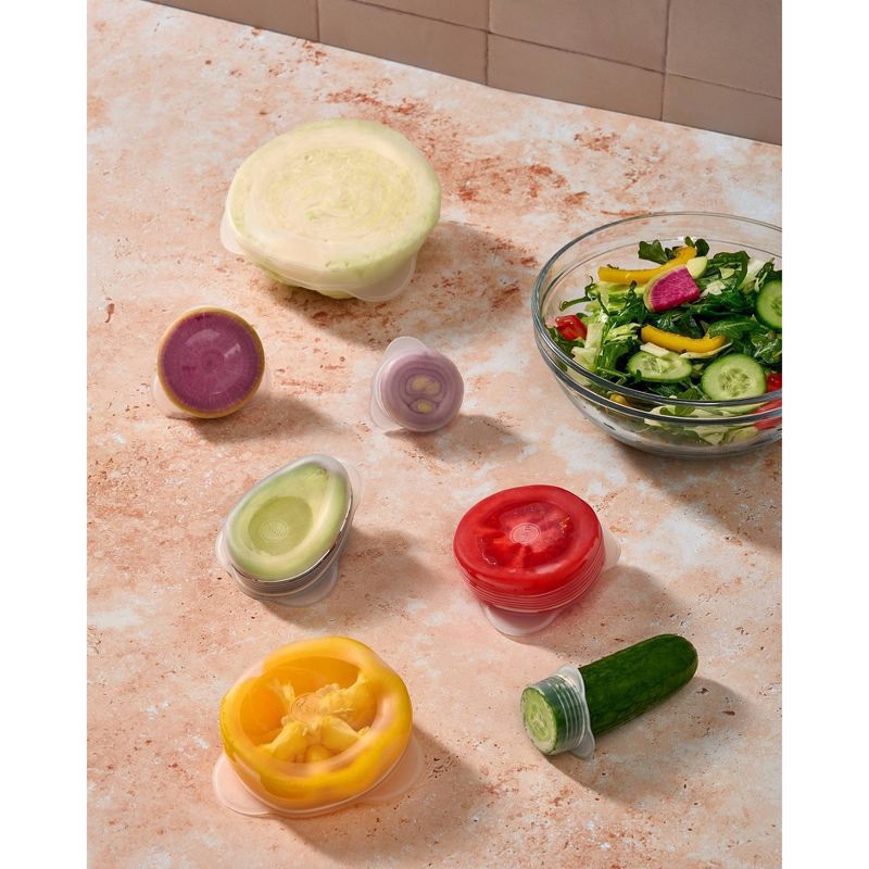 Kiss plastic cling wrap and aluminum foil goodbye! The Reusable Stretch Produce Savers are perfect for eliminating food waste by saving and storing half-eaten or cut up fruits and veggies, without sin…
