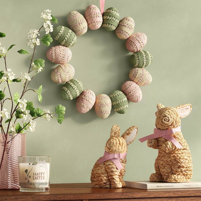 Bring rustic style to your Easter setup with this Easter Woven Standing Bunny from Threshold™. Woven from grass with foam filling, this standing bunny also features a pink fabric ribbon around the nec…