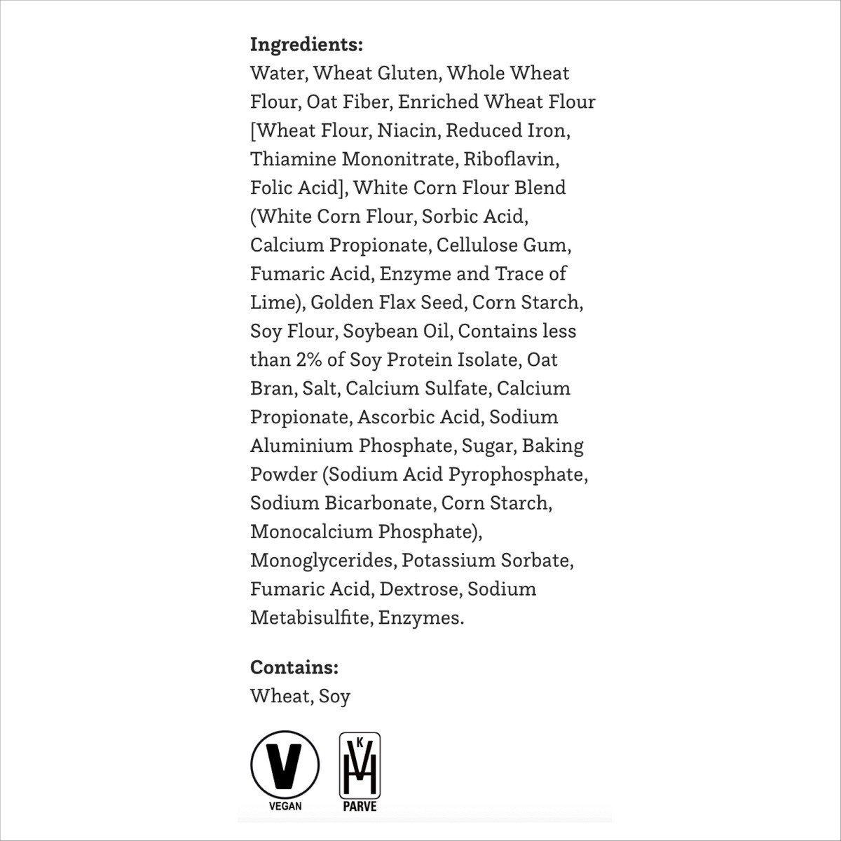 Water, Wheat Gluten, Whole Wheat Flour, Oat Fiber, Enriched Wheat Flour [Wheat Flour, Niacin, Reduced Iron, Thiamine Mononitrate, Riboflavin, Folic Acid], White Corn Flour Blend (White Corn Flour, Sor…