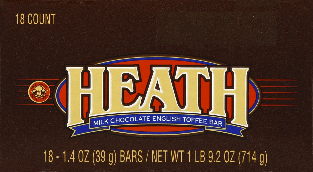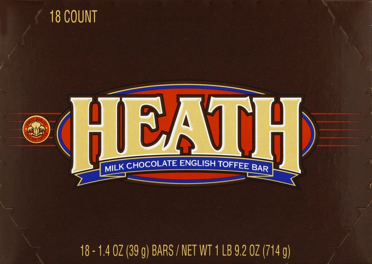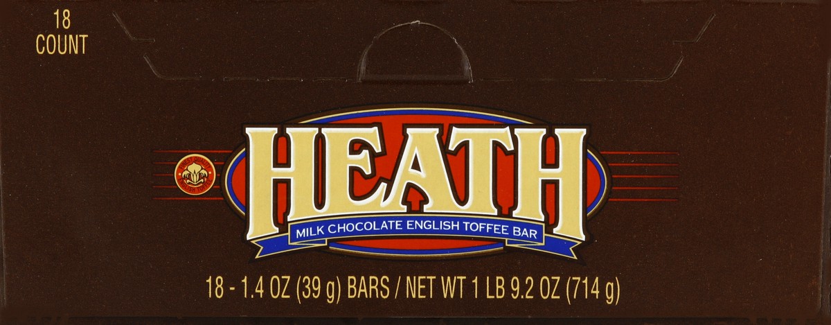 - Contains eighteen (18) 1.4-ounce HEATH English Toffee Enrobed in Rich Chocolatey Coating Candy Bars in a bulk boxA toffee candy bar is perfect for quick snacking at home, at work and on the goKosher and gluten free chocolatey English toffee candy bars individually wrapped for lasting freshness and convenienceBring chocolatey toffee treats with you to birthday parties, anniversary dates and bake-off eventsPrepare your taste buds for chocolatey English toffee candy bars that are perfect for sharing and savoring as you create Easter, Christmas, Valentine's Day and Halloween candy treatsEnjoy a HEATH candy bar as a movie night snack, baking ingredient and ice cream topper
