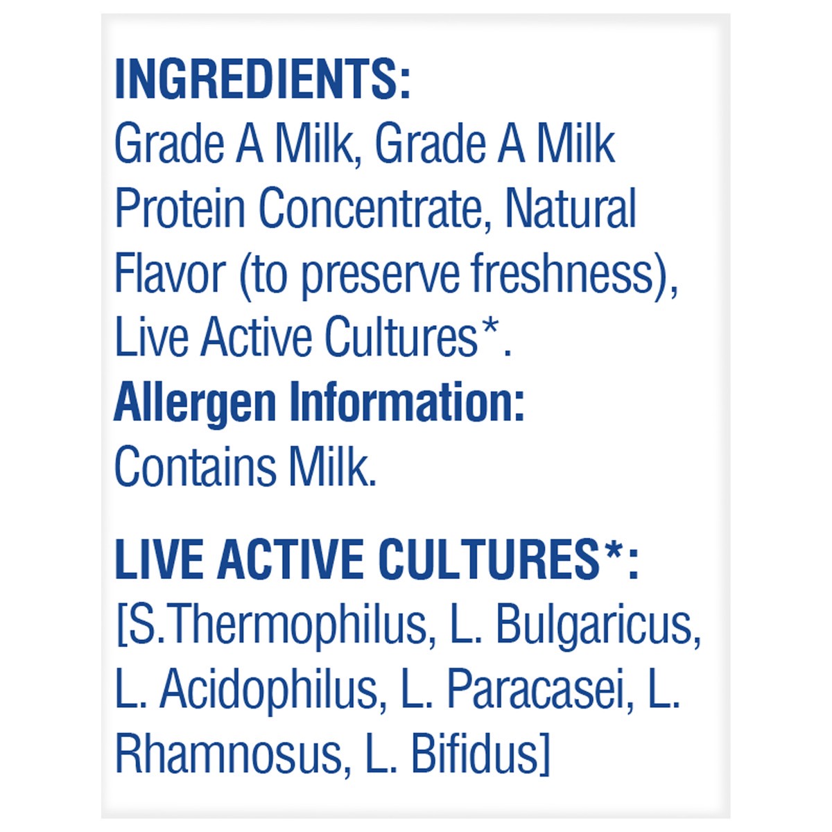 Grade A Milk, Grade A Milk Protein Concentrate, Natural Flavor (to Preserve Freshness), Live Active Cultures*. Live Active Cultures*: [S. Thermophilus, L. Bulgaricus, L. Acidophilus, L. Paracasei, L. …