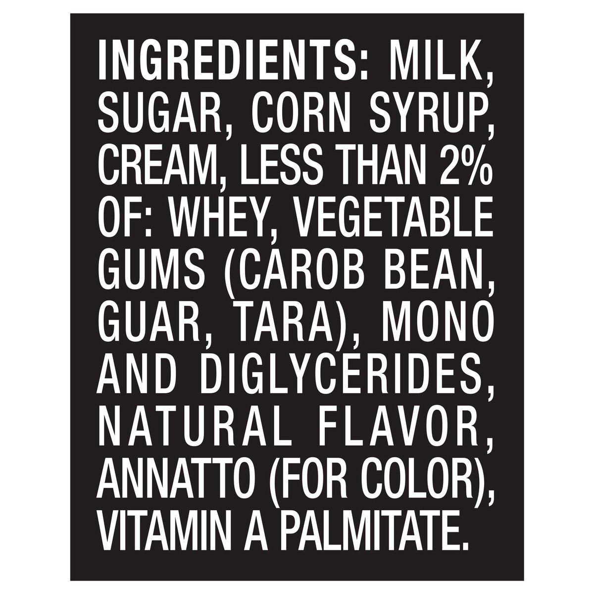 Milk, Sugar, Corn Syrup, Cream, Less than 2% of: Whey, Vegetable Gums (Carob Bean, Guar, Tara), Mono and Diglycerides, Natural Flavor, Annatto (for Color), Vitamin A Palmitate.