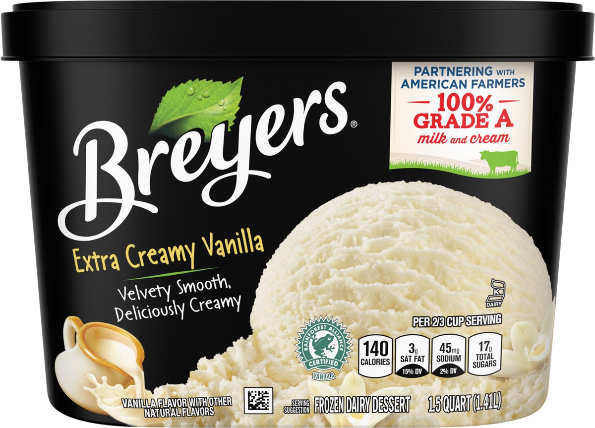 - Breyers Extra Creamy Vanilla is our creamiest vanilla frozen dairy dessert. Fresh cream & sweet vanilla come together in every velvety bite. Perfectly pairs with shakes and sundaes.This delicious frozen treat is made with fresh cream