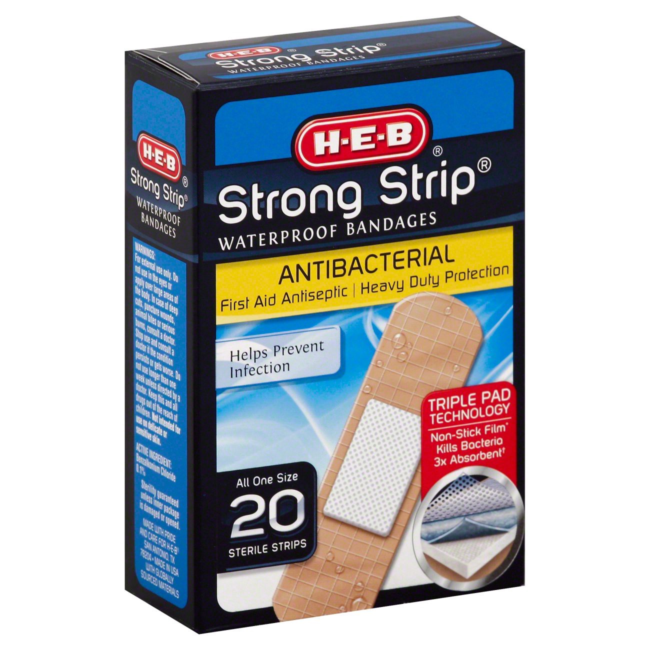 1 x 3-1/4 inch. Sterile strips. 100% waterproof. Heavy duty. Comfortable. 2x stronger than plastic bandages. Latex free. H-E-B Waterproof Strong-Strip Bandages help seal the wound for clean healing. F…