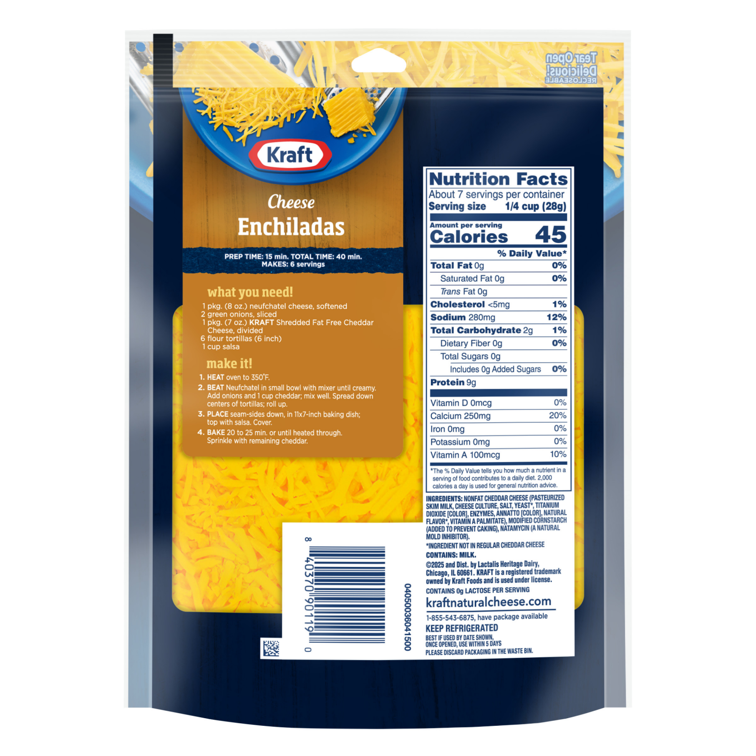 Nonfat Cheddar Cheese (Pasteurized Skim Milk, Cheese Culture, Salt, Yeast*, Titanium Dioxide [Color], Enzymes, Annatto [Color], Natural Flavor*, Vitamin A Palmitate), Modified Cornstarch (Added to Pre…