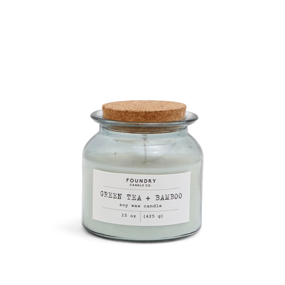 Foundry's Green Tea & Bamboo 15 oz. soy-wax blended candle with a cotton wick features fresh fragrance notes of cucumber, jasmine, and blue bamboo. Our apothecary style transparent pale blue glass jar…