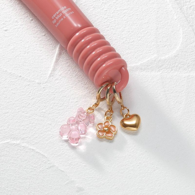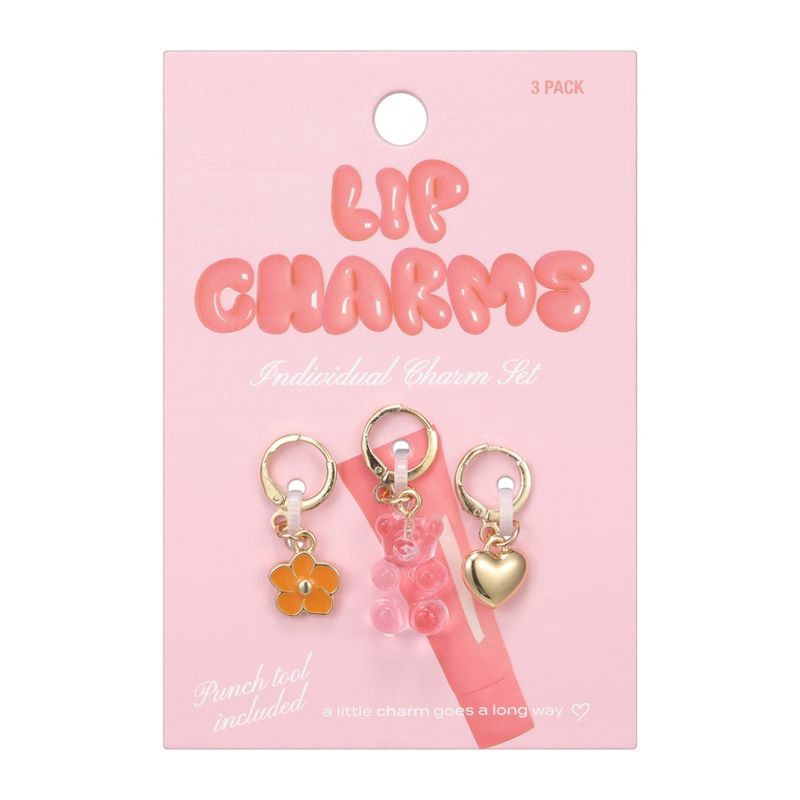 - 3‑Pack lip charm set—pink gummy bear, orange flower, and gold puffy heart
