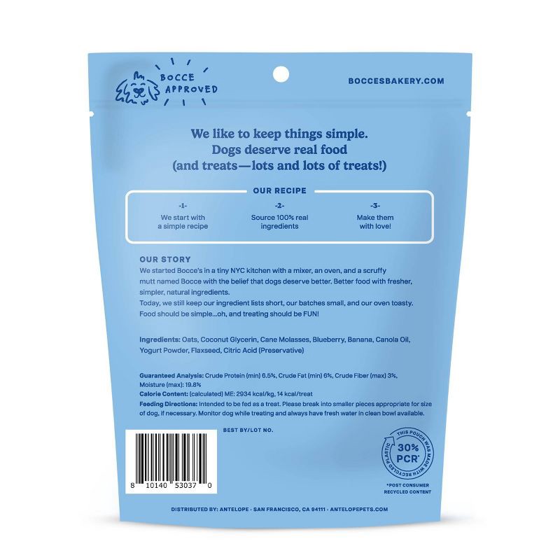 Oats, Coconut Glycerin, Cane Molasses, Blueberry, Banana, Vegetable Oil, Yogurt Powder, Flaxseed, Citric Acid (Preservative)